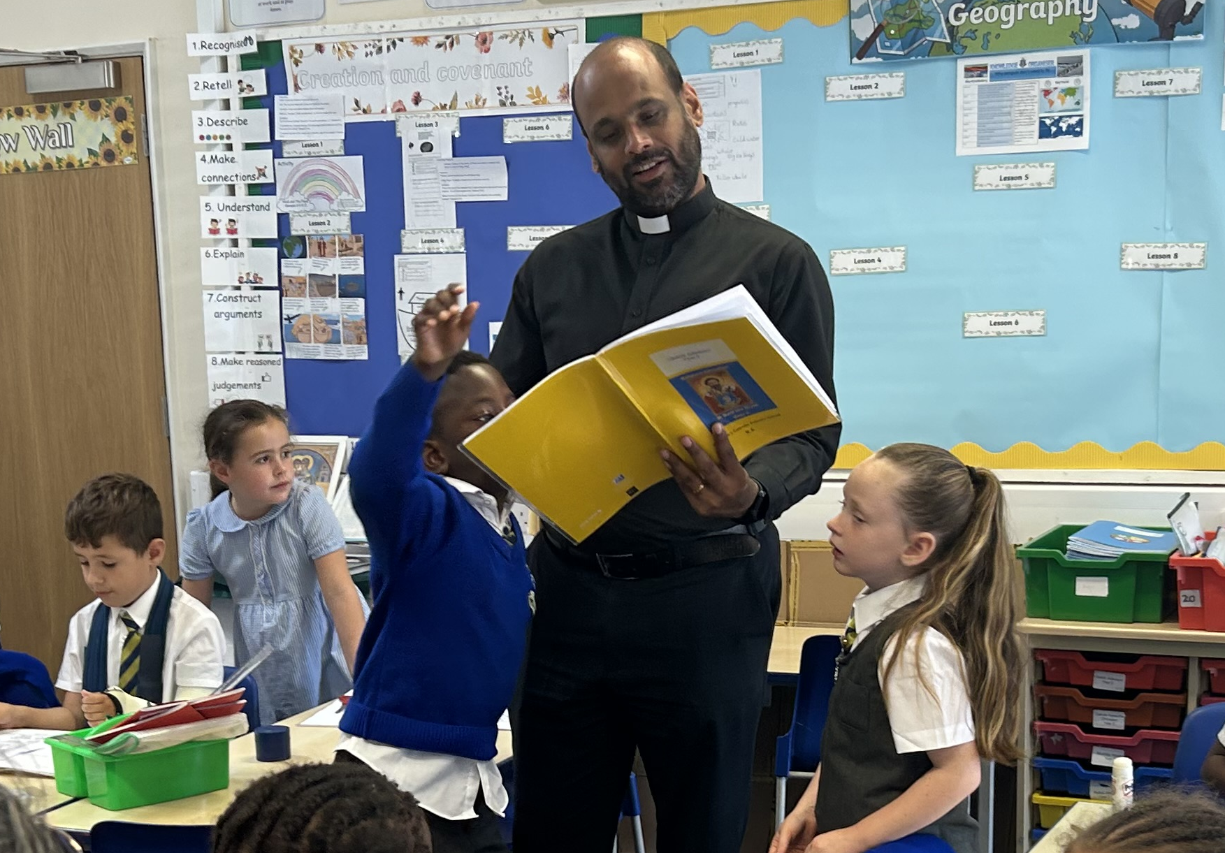 Fr Sabu, our parish priest and foundation governor, visited the classes today to see how the learning environment, behaviour and lessons aligned with our Catholic Life and Mission. He was pleased with what he saw, saying that this was the Bible being applied to the modern world in a way that young people could understand.