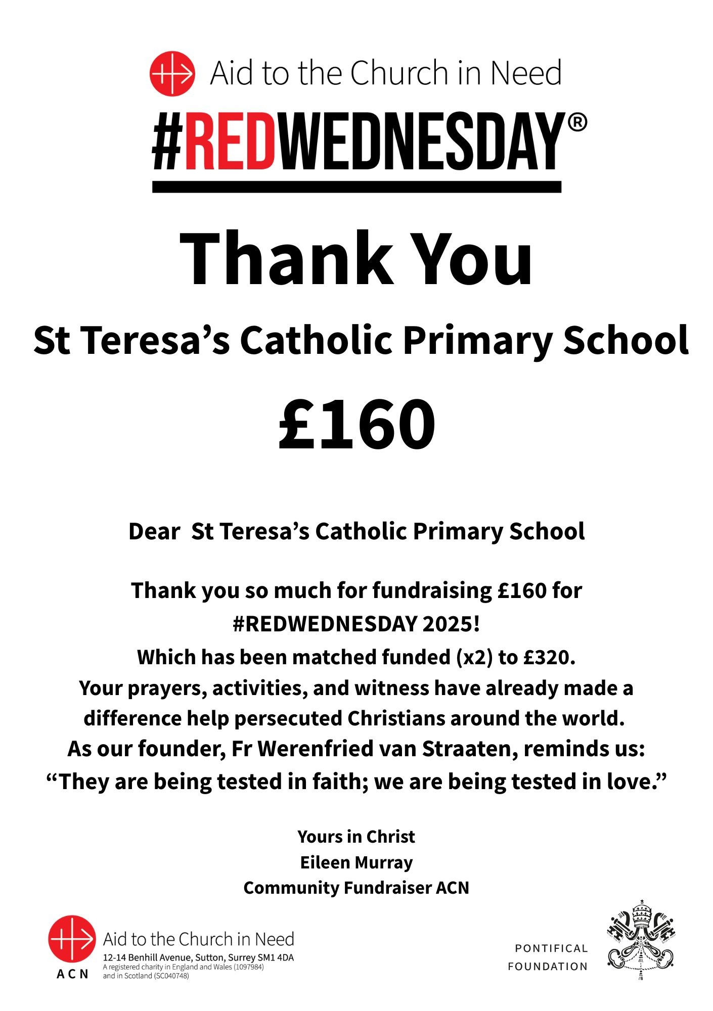 Readers may recall that last month we marked “Red Wednesday” at the school. Our fundraising efforts have been officially recognised with a certificate awarded from ACN which celebrates our achievements! Well done everyone!