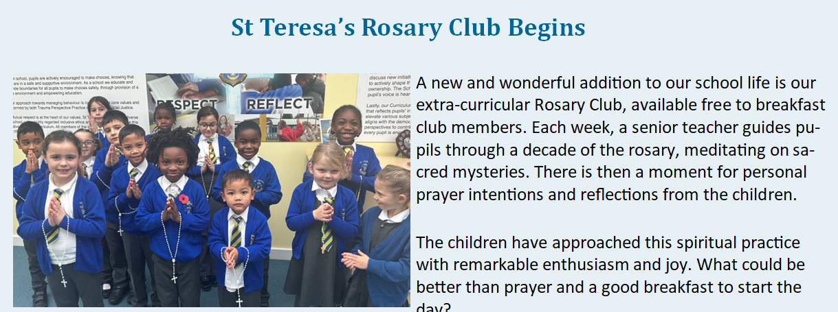 I must congratulate our EYFS children for their outstanding collective worship presentation to their mums and dads. They spoke with such clarity and confidence, demonstrating just how much they have grown throughout this academic year. It was wonderful to see how ready they are for their transition to Year 1. These young pupils truly embodied the spirit of St Teresa's, and their families should be incredibly proud of their achievements.