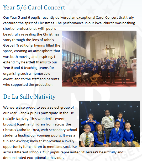 I'd like to extend my heartfelt thanks to our staff, parents, families, governors, representatives of the parish, and members of our trust who came to support both the morning and afternoon performances. Your presence and encouragement mean the world to our young performers and contribute significantly to the warm, supportive atmosphere we cherish at St Teresa's.