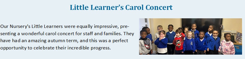 Our KS1 and Early Years nativity was a resounding success, filling us all with pride and joy. Noura's portrayal of the “Sleepy Shepherd” was excellent, while Aizah and Max impressed us all as Mary and Joseph. Evelyn shone brightly as the star! All our Year 2 actors and singers made us proud! It was particularly delightful to see how much our Year 1 pupils have grown since their Early Years, demonstrating their progress through brilliant signing and performances. The wise men, in particular, spoke their lines so clearly! And of course, the Early Years children were simply amazing, learning the songs and looking adorable as barnyard animals. Their confidence and joy on stage were a testament to their development and the nurturing environment we strive to provide at St Teresa's.